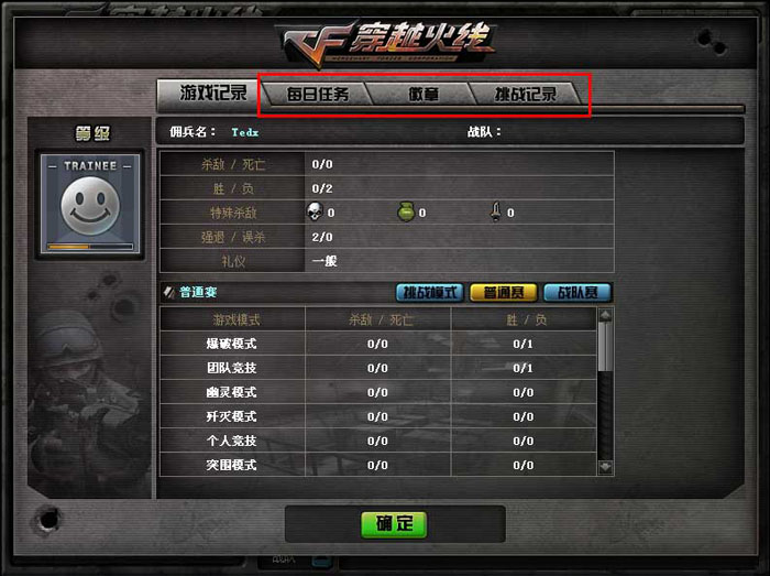 此外,新版本还丰富了“角色属性”的内容,玩家除了查看原有的“游戏记录”,还可以查看自己角色的:“每日任务”、“徽章”、“挑战记录”信息,如下图: