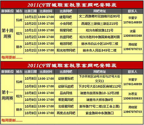 周周有比赛,月月有冠军,人人有奖品!如火如荼的七月,百城联赛秋季赛隆重登场!这里将给你证明自己实力的舞台,这里有挑战不完的强者,这里有最激情的竞赛!2011年浙江百城联赛秋季赛,我们期待英雄的诞生!第十周10月1日国庆节当天只要你是百城联赛的参赛选手,无论你在哪里,我们都将在宁波江北万达金座等待你的到来,领取我们精心准备的好礼、参加我们的盛会!
