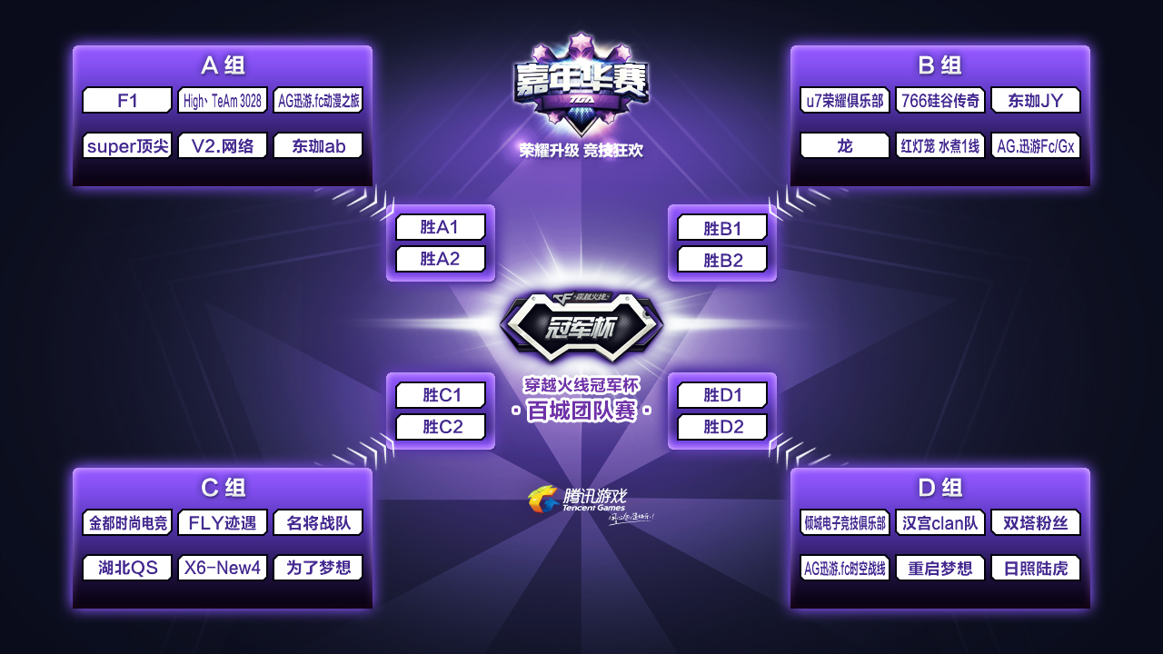 TGA大奖赛CF项目线上抽签分组已经结束,24支出线队伍也将根据具体分组情况,于19号在网吧进行小组循环赛、男女混合赛小组赛,以下是冠军杯具体分组详情: