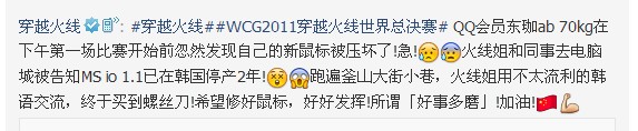 备受关注的WCG2011世界总决赛穿越火线项目,在第一日的小组赛中,就火热异常。也许是战况太激烈了,QQ会员东珈ab的队员70kg在下午的时候,却突然告知随行的火线姐,他的鼠标出问题了。随行的人都非常焦急,鼠标作为FPS电竞选手最为重要的工具之一,如果在这上面出了问题的话,会严重影响队员在比赛中的发挥的。