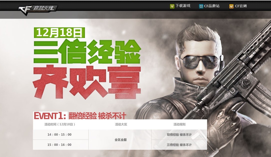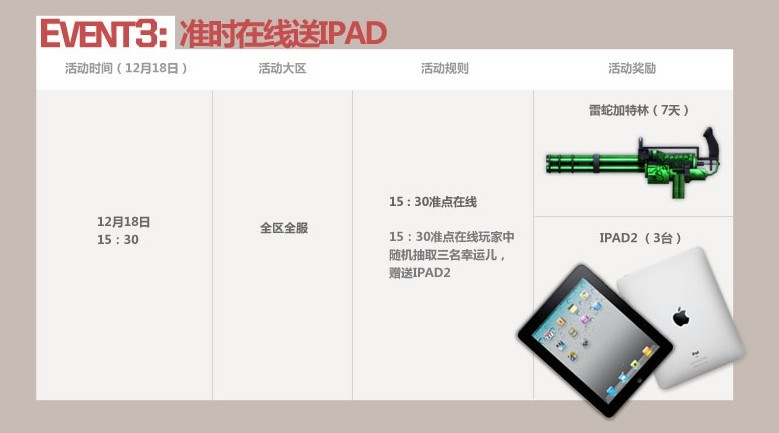 在12月18日的下午14点至16点,《穿越火线》全区全服开启多倍经验和被杀不计活动,不同时间段完成不同任务还可得精美游戏道具。15点30分,只要准点在线,即可获得雷蛇加特林(7天),更有三位幸运儿将获得IPAD2一部。