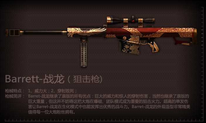 以美国Barrett公司的反器材狙击步枪M82A1为原型制作的特别版,枪身犹如盘绕着一条黄金战龙,彰显着使用者的实力,是一把兼具性能和收藏价值的不可多得的神兵。