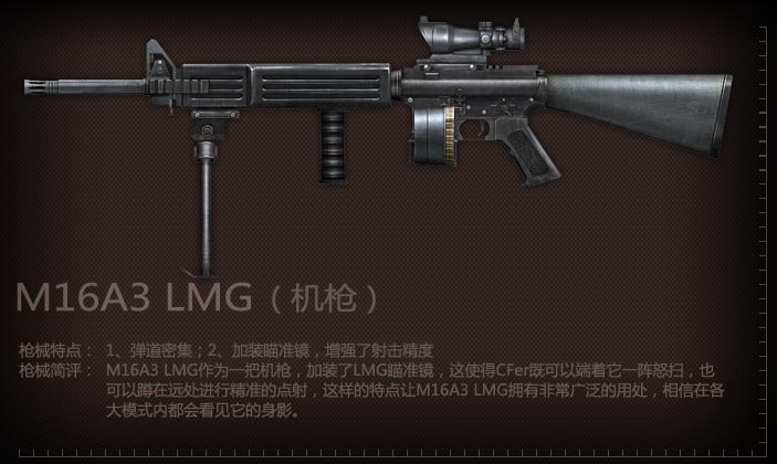 LMG是美国Colt公司在M16的基础上研发的支援武器,具有极强的火力压制能力。与其他机枪不同的是,它加装了瞄准镜,可以在中远距离进行精确射击,可谓如虎添翼。