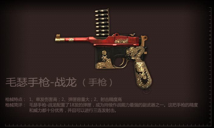 以著名的毛瑟手枪为原型,增加了装弹数,具有单发和3连发两种模式,稀有的黄金战龙皮肤使这把名枪更加珍贵。