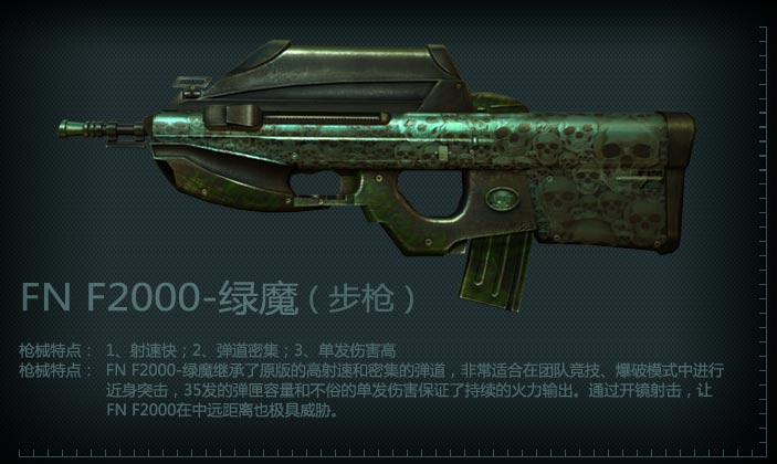 F2000-绿魔具有更大的弹匣容量和更高的战斗力。神秘的绿色骷髅外观,让这把杀敌利器透着几分鬼魅,有着很高的收藏价值。