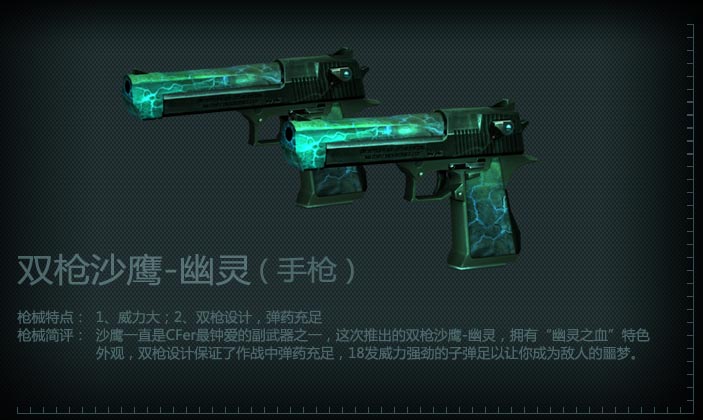 威力强大的沙漠之鹰的双枪版本,增加了装弹数,提升了持续作战的能力。由于使用了特殊的“幽灵之血”材料进行制作,双枪沙鹰-幽灵具有独一无二的外观,极具收藏价值。