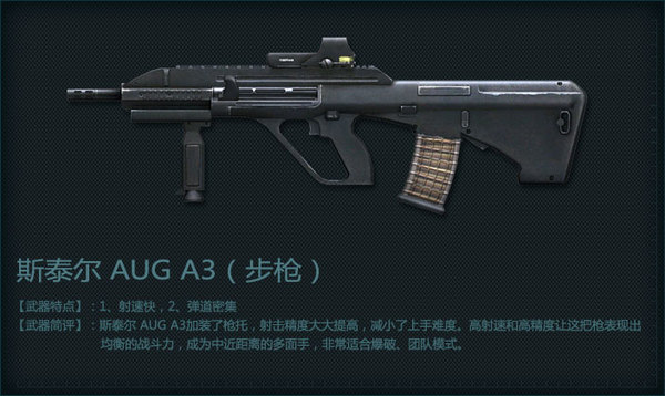 世界名枪Steyr Aug系列的最新型号,杀伤力不俗,由于加装了握把,减小了后坐力,稳定性和准确度更高,整体战斗力得到很大提升。