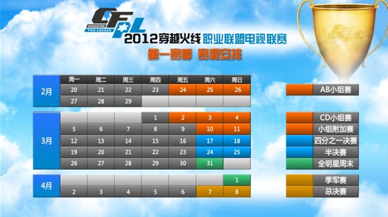 本赛季CFPL比赛从2月24日一直进行到4月8日。分为小组赛,附加赛,四分之一决赛,半决赛,季军赛和总决赛6个部分组成。