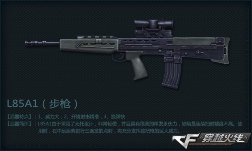 L85A1配备了一个光学镜头,在进行远距离射击时可进行开镜操作,除此之外,该武器采用的无托设计也大大减轻了枪械本身的重量,配合单发超高的杀伤力以及较快的换弹速度,在水下作战中,L85A1可以将它的优势发挥的淋漓尽致。