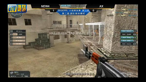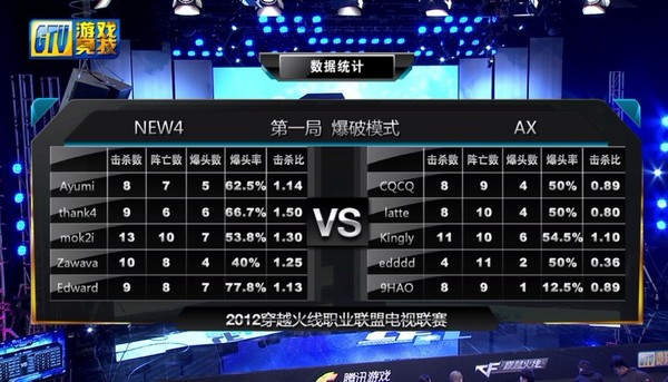 2012年穿越火线职业联盟电视联赛小组附加赛第二场潜力黑马AX战队对抗老牌强队NEW4战队,胜出的队伍将晋级CFPL全国八强。