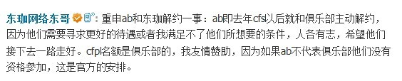 重申ab和东珈解约一事:ab即去年cfs以后就和俱乐部主动解约,因为他们需要寻求更好的待遇或者我满足不了他们所想要的条件,人各有志,希望他们接下去一路走好。cfpl名额是俱乐部的,我友情赞助,因为如果ab不代表俱乐部他们没有资格参加,这是官方的安排。