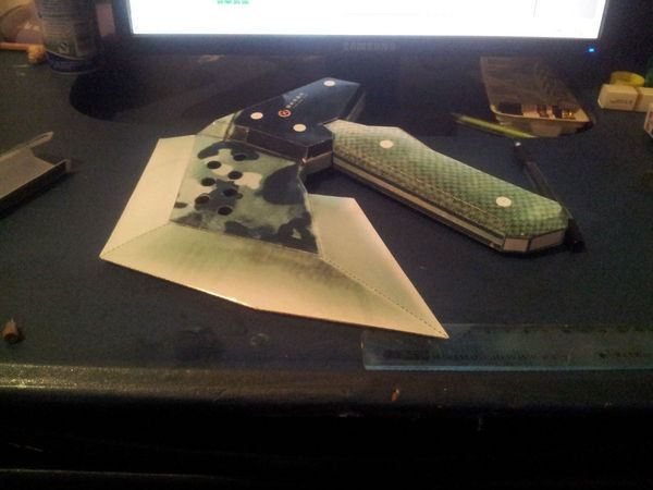 今天休假一天,把前几天打印的斧子做了出来,话不多说,下面上图。。还有点建议就是做出来比例有点大,应该适当缩小点打印。先上制作工具,比较简陋,家里什么都没,一个纸盒子盖子(当垫板),一把裁纸刀,三瓶502,尺子,没水儿。下面先上成品图吧
