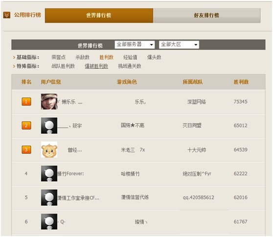 我们知道排行榜一般需要设定排行的指标(排行的依据)和排行范围,我们的CF排行榜也不例外,CF排行榜的排行指标分为:基础指标和特殊指标,基础指标分为:荣誉点、杀敌数胜利数、经验值和爆头数;特殊指标有,战队胜利数、爆破胜利数和挑战通关数。点选某一个排行指标,即可获得相应的排行榜了。