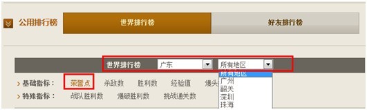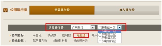 从图中可以看到,当选择了“胜利数”作为排行指标,就可以看到关于胜利数的排行情况了,仔细看下可以发现前三名是可以获得突出显示的。排行范围分为“世界排行榜”和“好友排行榜”,其中“世界排行榜”部分,系统会根据您选择的“排行指标”提供可供选择的“排行范围”,比如当选择“经验值”时,排行范围为服务器大区,见下图: