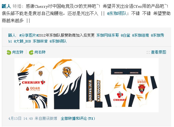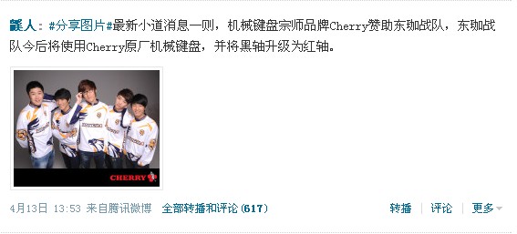 近日据可靠消息称全球顶级外设Cherry成为了东珈精鹰的外设赞助商,并且在微博曝光了Cherry成为外设赞助商后的队服。