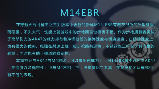 威力较高移动、切枪、换弹速度快穿射对敌方造成伤害不衰减。M14EBR的射速与M4等主流枪支相当,但其强大的威力使得M14EBR整体性能更为突出。