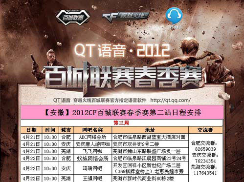 【安徽】2012CF百城联赛春季赛第二月第三周日程安排: