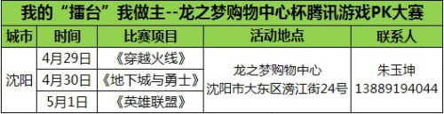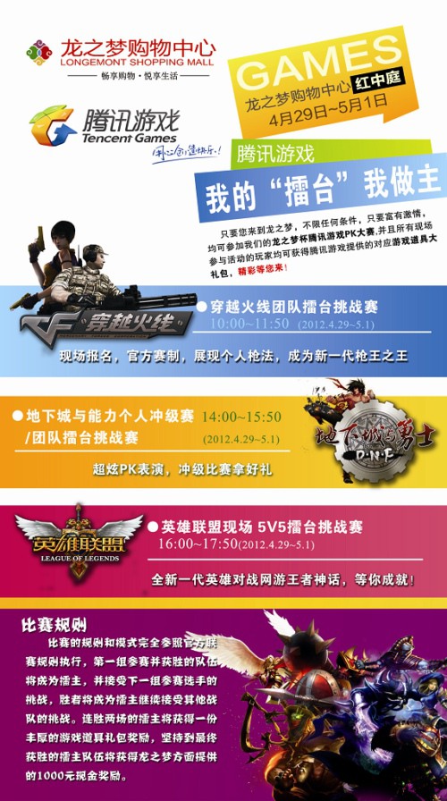 龙飞舞动,闪耀全城!腾讯游戏携热门力作《穿越火线》、《地下城与勇士》、《英雄联盟》空降东北最大shopingmao———龙之梦购物中心,激情摆擂,与你决战当下。五一假期不再寂寞,诚邀腾讯游戏玩家加入“龙之梦购物中心杯腾讯游戏PK大赛”,我的“擂台”我做主!