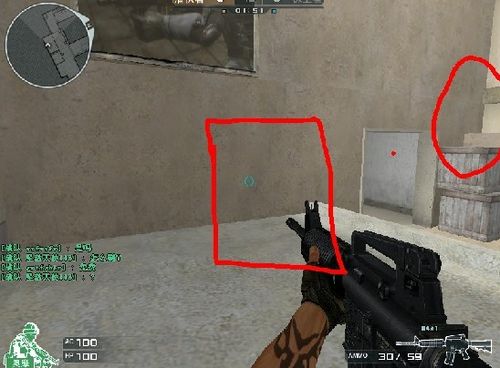 画红圈的两个地方是守着这个左门的地方,圆红圈利于爆头(提醒打一个就跳下来)方红圈只要枪口对准也可以爆头,打一个最好也到正前面拼。