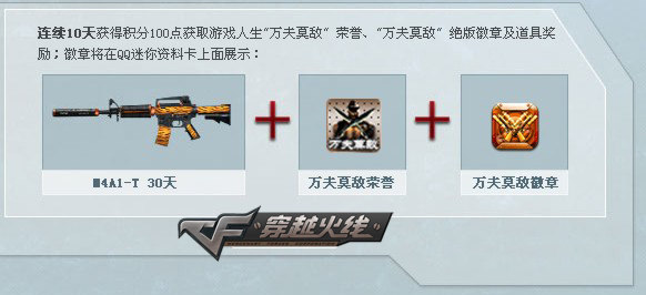 只需在活动期间,连续10天获得积分100点,即可获取游戏人生"万夫莫敌" 荣誉、"万夫莫敌" 绝版徽章及珍贵的M4A1-T(30天)奖励。
