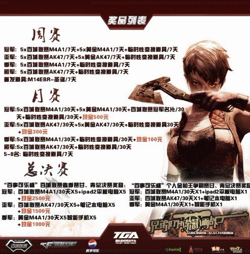 凡参加“百事可乐杯”百城联赛春季赛及个人金枪王争霸赛的玩家都均有机会获得百事可乐提供的赠饮一瓶