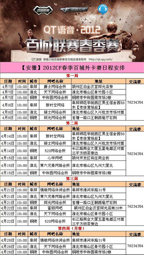 【安徽】2012CF百城联赛春季赛外卡赛第一周日程安排:
