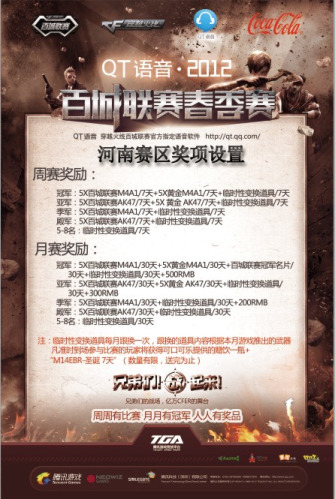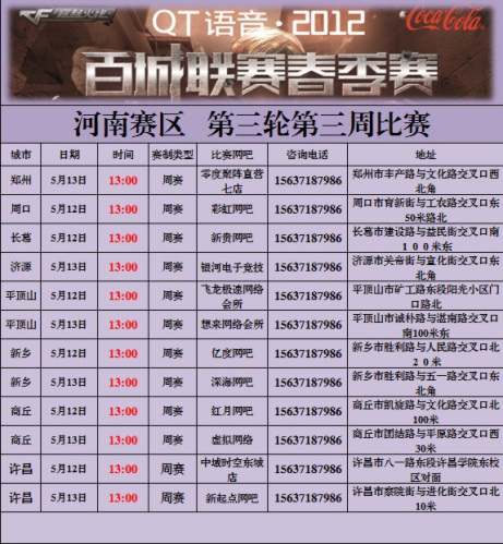 赛事说明:此比赛为腾讯官方比赛不收取任何费用,赛事类型为5V5团队赛,个人玩家也可到比赛现场自行组队。2012CF百城春季联赛河南赛区选拔赛,总计三轮比赛,第一轮比赛城市郑州、三门峡、濮阳、焦作、信阳,第二轮比赛城市驻马店、南阳、许昌、安阳、开封、洛阳,第三轮比赛城市周口、商丘、平顶山、新乡、郑州、漯河。比赛报名为比赛当天现场报名,请玩家在比赛开始前半小时到达比赛网吧报名登记,比赛开始后不接受玩家报名。