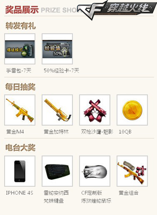 在玩家送上祝福并转播微博后,将获得CF送上的第一份大礼——手雷包或50%经验卡。实用的道具能在游戏中为玩家带来众多便利。CF送出的第二份大礼便是在每日抽奖中放出的包括黄金M4、黄金加特林、双枪沙鹰-魅影在内的绝版道具,珍贵而富有实用意义。CF放出的最终大奖分量十足,包括IPHONE4S、雷蛇安纳西梵蛛键盘、CF定制版炼狱蝰蛇鼠标在内的实物奖励将把活动推向高潮。