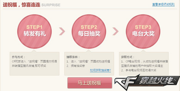 同期,CF联合QT语音举办了转发祝福抽大奖活动,简单的参与方式,将为玩家带来更多惊喜。玩家只需进入活动页面的“送祝福”板块,写上自己对CF官方电台的开播祝福,并转播至腾讯微博,即可获得CF游戏道具一份以及抽奖券一张。活动的最终大奖将在CF电台现场诞生,CF官方将在成功送祝福并转播至腾讯微博的用户中抽取大奖得主,当天在电台活动现场参与互动的玩家也将有机会获得最终大奖。