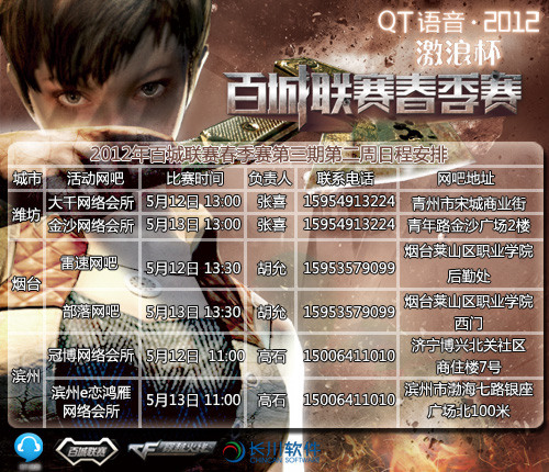 由腾讯济南办事处联合济南百事可乐饮料有限公司主办、山东长川软件有限公司承办的2012年“激浪杯”CF百城联赛春季赛山东赛区,本周将在潍坊、烟台、滨州赛区开战!经典CF道具M14EBR-圣诞版、近身武器收割者、百城联赛专属道具、黄金道具、激浪饮料等众多惊喜等待你的参与!