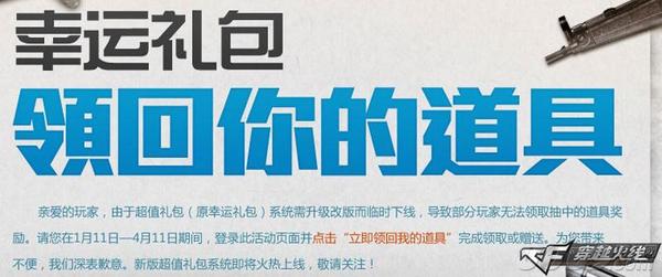 在新的超值礼包活动开启之际,之前的幸运礼包由于系统升级改版而临时下线,部分玩家还未抽中道具奖励的可以在1月11日-4月11日期间登陆新的页面完成领取或赠送。