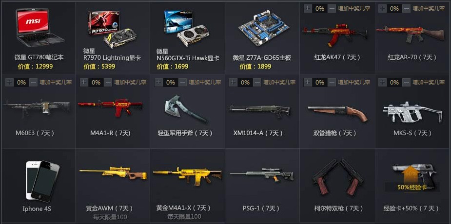 部分道具加入修改概率功能,玩家可以使用游戏时长增加该道具的中奖几率,每增加1%中奖率需消耗10积分。每次抽奖只能对一种道具增加中奖几率,可增加1%、5%、10%