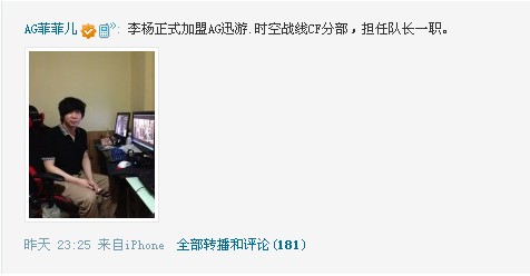 CFPL结束后,各大战队都有人员变动,最初的AB铁三角阵容也被拆分,作为AB队长的李杨先是传言去了老鱼的故事,后又有爆料说李杨离开了老鱼的故事,在昨天终于有权威消息声称,李杨已经加盟了AG迅游时空战线。