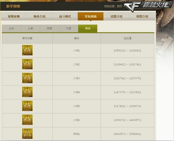 CF的军衔是荣誉的象征,也是CFer们实力的一大体现。在CF全新资料库的军衔资料中,玩家们可以清楚的查询到自己军衔的级别,以及达到各种军衔所需要的经验值,让玩家们了解军衔升级情况。