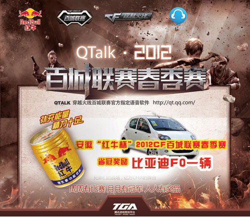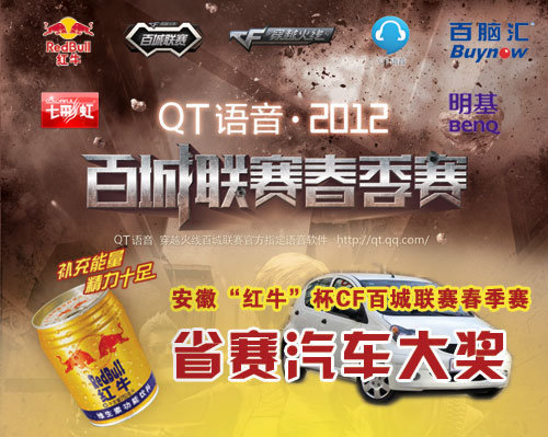 由腾讯安徽办事处联合红牛饮料安徽分公司主办,合肥百脑汇、合肥山水数码科技协办,安徽大安文化传播有限公司承办的2012年“红牛杯”CF百城联赛春季赛省决赛,本周末将进行巅峰对决,看谁能最终登顶安徽之巅,看谁能赢得高额现金奖励以及汽车大奖,即将一见分晓。月冠队伍,战起来!你们要用手中的钢枪拼死捍卫战队的荣誉,不容敌人前进一步,用热血谱写胜利的战歌。准备好了吗?你到底行不行,赛场见!