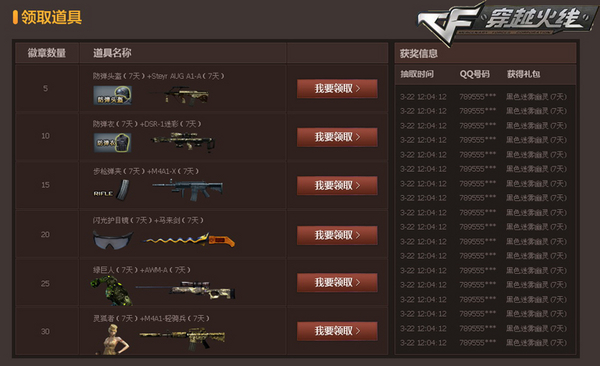玩家领取道具后徽章将不会被消耗,达到相应数量即可领奖。所有奖励均无限量,玩家在除挑战模式外的任意模式完成任务均能点亮徽章。CFer达到徽章数量要求,可于一天领取多种道具,每个QQ帐号每种奖励限领取一次,不可重复领取。玩家领取奖励后,礼物将直接发放到相应游戏账号中。