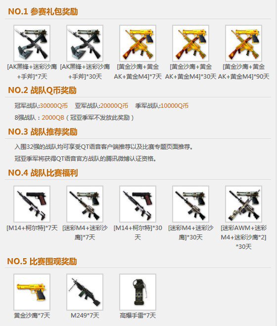 本次比赛将根据认证战队比赛成绩,发放不同类别的礼包。首轮淘汰赛获胜战队可获得AK黑锋、迷彩沙鹰、手斧、M14与柯尔特等珍惜枪械奖励。登录QT888围观战队比赛直播的CFer还有机会获得“比赛围观奖励”——黄金沙鹰、M249与高爆手雷。
