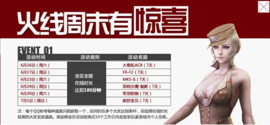 自6月16日至7月1日,CF每周末都会在全区全服展开在线得好礼活动,玩家只需要在活动期间内进入游戏,在线时长达到180分钟,即可享有周末在线礼包。每个周末的礼包奖励不同,玩家在指定日期完成任务即可获得当日礼包。