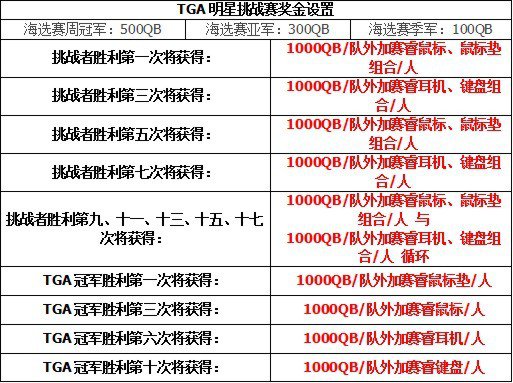 挑战擂主胜利的队伍将获取丰厚奖励,失败队伍则相对获取少量奖励,由TGA大奖赛冠军继续担当擂主,直至全程赛事结束。