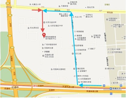地铁八通线传媒大学站A口(西北口)西行200米,穿行花园闸北里小区北行