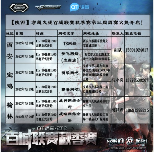 2012年7月28日至29日,西安,宝鸡,榆林三地开战穿越火线百城联赛秋季赛!这万众瞩目的一刻,CFer会以什么样的状态亮相呢?期待你们的到来,百城联赛秋季赛烽烟再起,激情盎然的战场为你开启,鼓足你的勇气,来和你的队友加入吧,CF,三亿鼠标的梦想,无论你是平民玩家,还是高端玩家,让梦想飞跃吧!