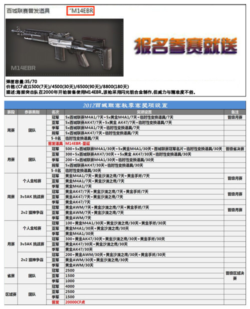 周周有比赛,月月有冠军,人人有奖品!穿越火线百城联赛又一次激战袭来。首月,宁波、金华、湖州三地狼烟四起,四方战士身怀冠军梦重返战场,铺设自己的光荣之路!荣誉、激情、友情,尽在2012年浙江百城联赛秋季赛,你还在等什么?兄弟们,站起来!