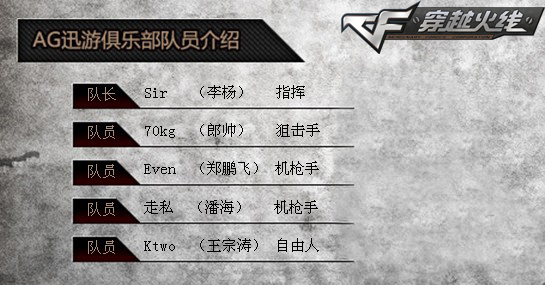 随着《穿越火线》(简称CF)各大赛事比赛水准与参与人数的日益提高,参赛选手的职业化程度日渐成为决定赛事战绩的关键因素,汇聚多位明星选手,组建全明星阵容,亦成为不少顶尖职业俱乐部的明智选择。在这批率先尝试全明星阵容的一线CF队伍当中,以Sir(李杨)、70kg(郎帅)、Even(郑鹏飞)、走私(潘海)与Ktwo(王宗涛)所组成的AG迅游时空战线绝对堪称个中典范。
