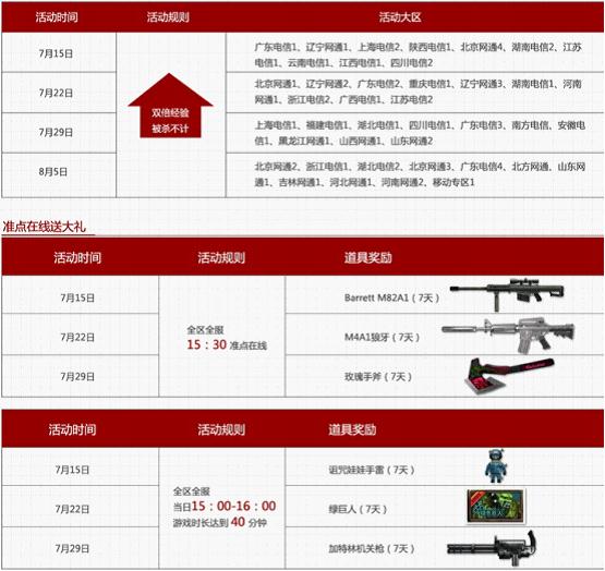7月28、29日周末两天,将会开展部分大区双倍经验被杀不计活动,玩家可以在周末尽情游戏,畅快升级。另外,在7月29日CF还特别开启在线得好礼活动,每天的15:30分只要准点在线,就可以获得玫瑰手斧。在当日的15至16点之间,游戏时长达到40分钟,还可以额外获得游戏道具。单个时段,双倍乐趣,让你周末乐翻天。