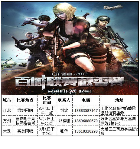 重庆2012CF百城联赛秋季赛七月月赛即将隆重上映!前三周晋级的战队和个人金枪赛的选手,本周月赛我们将再次相会。谁才是最终的冠军得主,我们月赛见分晓。本次秋季赛,新增百城联赛主题月,本周为个人金枪赛决赛,前三周晋级的选手不要错过最终的角逐哟!众多的礼品、丰厚的大奖等你来拿!参与即有机会领取礼包一份!