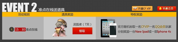 在当日的15:30准点在线的玩家都将获得灵狐者角色(7天)作为活动奖励,同时官方还将从CFVIP会员以及QQ会员玩家中随即抽取一名幸运玩家分别奖励一台New Ipad或一部Iphone 4S。