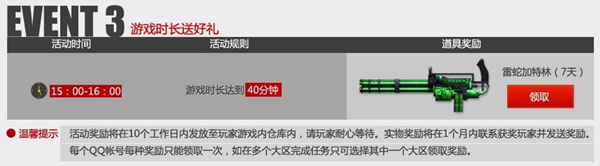 精彩继续,在当日15:00—16:00期间游戏时长达到40分钟的玩家均可获得限量雷蛇加特林(7天),重火力武器助你在夏日竞技场上出尽风头。