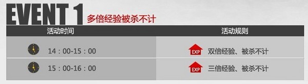 在8月5日的14:00—15:00期间玩家只需登录CF体验游戏即可享受全区双倍经验被杀不计,在15:00—16:00期间给力升级,全区三倍经验并且被杀不计,让你在周日一战经验赚足,等级**快速提升,把战绩刷到爆。