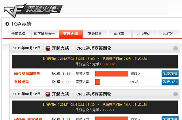 参与TGA平台每周竞猜活动的方式极其简单——只需登陆活动相关页面,对CFPL相关比赛场次进行“加油”,在限额内自由决定投入每场比赛的竞币数,即可参与竞猜。(已“加油“的比赛还可以追加竞币给已选择的队伍,但每次投入竞币总数不能超过限额