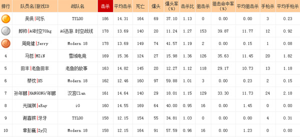 汉宫在第一赛季取得了不俗的成绩,队长年鹏居功至伟。作为一名狙击手,年鹏是以24个手枪击杀在这项统计中独占鳌头。而他在队中更是担任了指挥核心的角色,除了个人发挥的同时,还要调度全队。汉宫目前2胜1负积5分,接下来的比赛还会更为凶险。也希望年鹏能够带领汉宫能够有着更好的发挥。年鹏以161击杀、1.15的击杀比位列榜单第7。